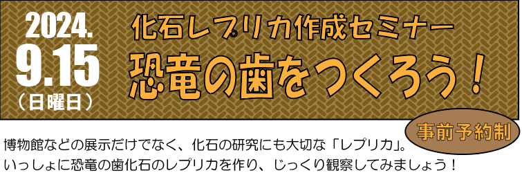 内容:博物館などの展示だけでなく、化石の研究にもとても大切な化石の「レプリカ」。セミナーの前半では、化石の「レプリカ」がどんな風に作られるのかを学びながら、恐竜の歯化石のレプリカづくりを体験します。セミナーの後半では、恐竜の歯についての講義を行います。できあがったレプリカをじっくりと観察し、どんな恐竜の歯なのか、どんなものを食べていたのかを考えましょう。