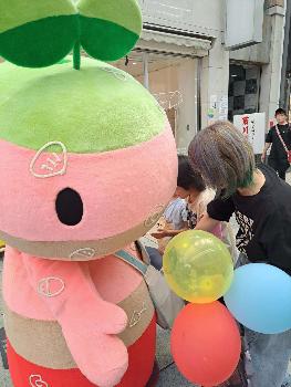 ちーたんの風船と缶バッジを持ってハイポーズ。