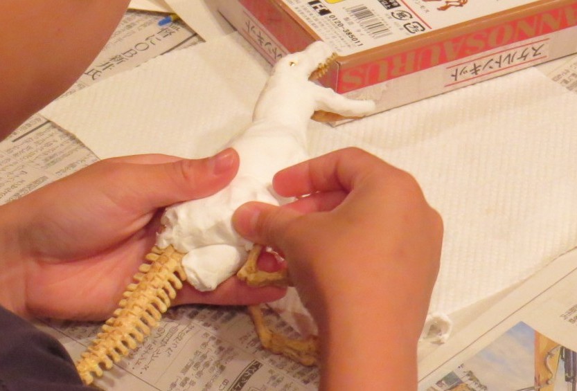 ティラノサウルスの全身骨格をベースに粘土で肉付けし、体の色を塗って復元しよう!